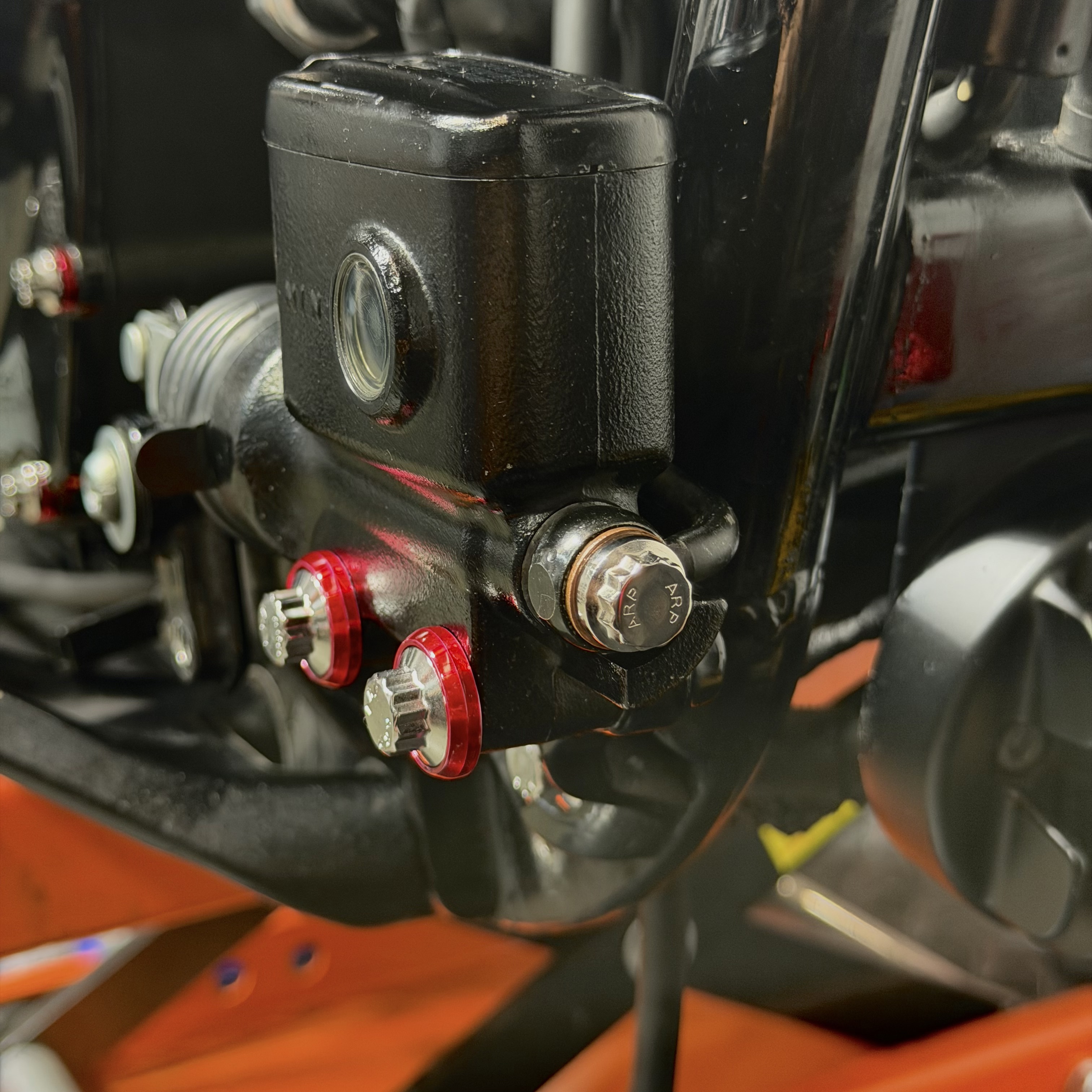Our standard Black finish, on the other hand, is a clean, flat black that blends in with most motors. It’s more understated and stealthy, making it ideal for riders who prefer a low-key, murdered-out look where the bolts don’t draw too much attention.