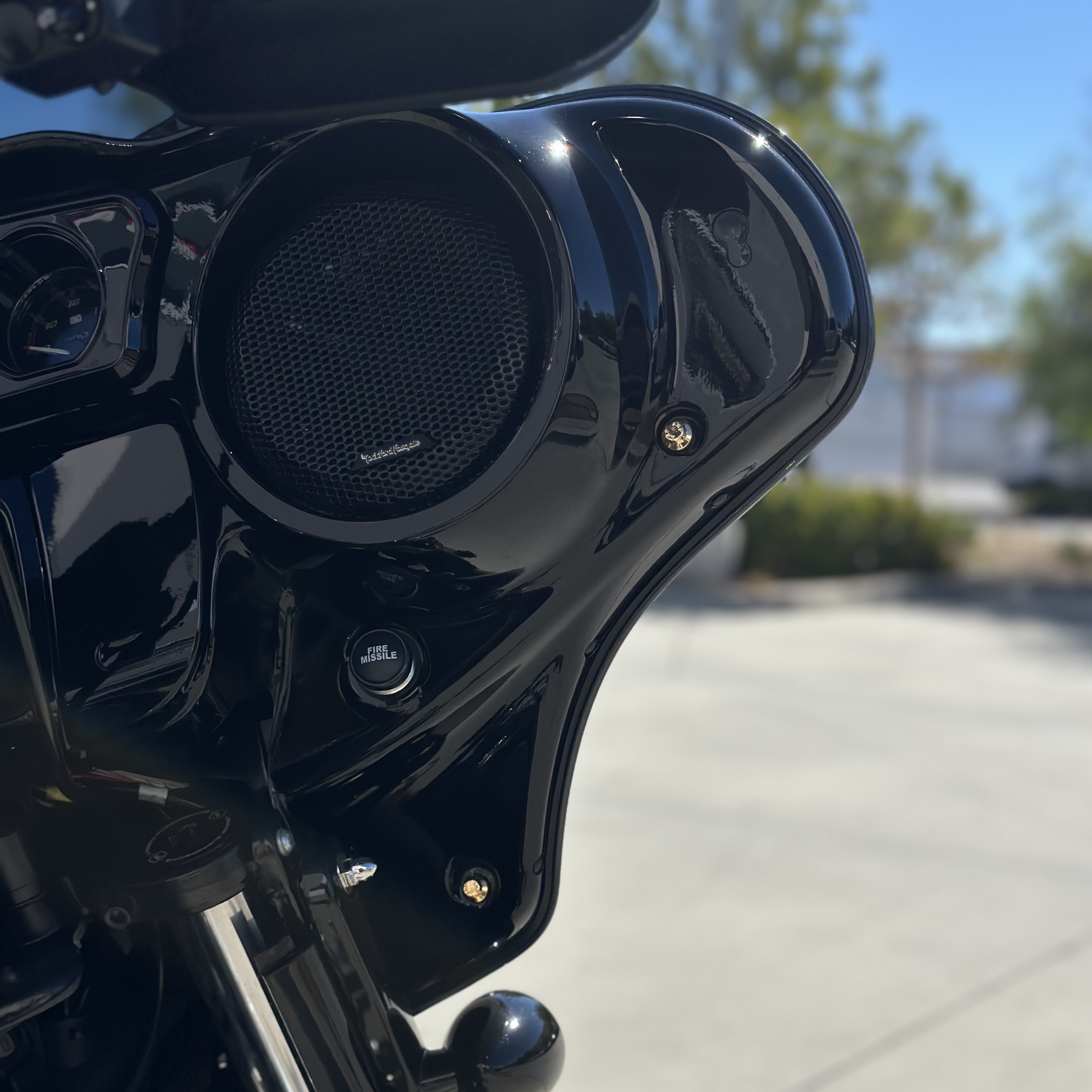 Our standard Black finish, on the other hand, is a clean, flat black that blends in with most motors. It’s more understated and stealthy, making it ideal for riders who prefer a low-key, murdered-out look where the bolts don’t draw too much attention.